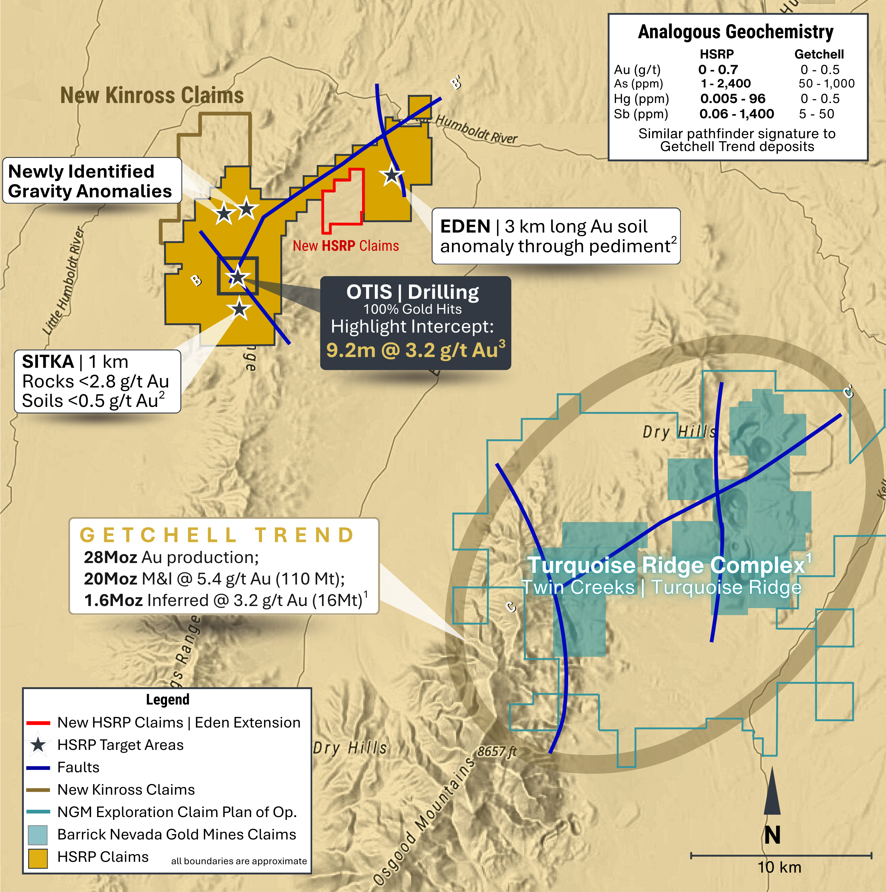 This latest staking secures an important extension of the emerging new Carlin-type oxide gold system discovery at HSRP, positioned parallel to the prolific Getchell Trend — home to major high-grade Carlin-style deposits including Turquoise Ridge and Twin Creeks¹. The new claims target the Eden Corridor, where recent gravity survey results (see Figure 2) confirm a much larger and continuous structural corridor than previously recognized, extending southwest from the high-priority Eden target. Supporting data includes a 3 km long gold-in-soil anomaly (defined by CSAMT surveys and soil sampling through pediment cover), with geochemical signatures and structural architecture closely mirroring world-class Getchell Trend deposits, including robust thrust faults intersecting deep crustal feeders — the same controls observed at Turquoise Ridge and at the Company’s Otis discovery hole.