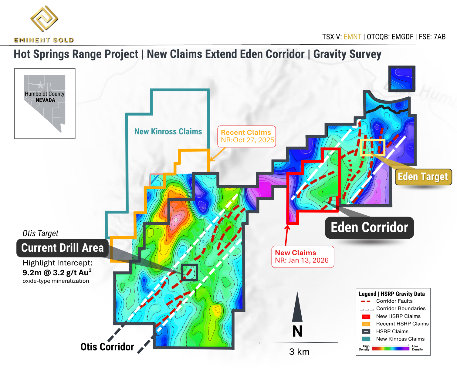 Vancouver, British Columbia, January 13, 2026 – Eminent Gold Corp. (TSX-V: EMNT OTCQB: EMGDF FSE: 7AB) (“Eminent” or the “Company”) is pleased to announce the staking of new claims totaling 370 hectares (see Figure 1) at its 100%-owned Hot Springs Range Project (“HSRP”) in Humboldt County, Nevada. This strategic expansion along the prospective Eden Corridor — directly following the Company’s significant oxide gold intercept at Otis (9.2 m @ 3.2 g/t Au) announced in the news release dated January 6, 2026 — highlights the emerging district-scale potential of the project, bringing the total HSRP land package to 4,311 hectares under claim.